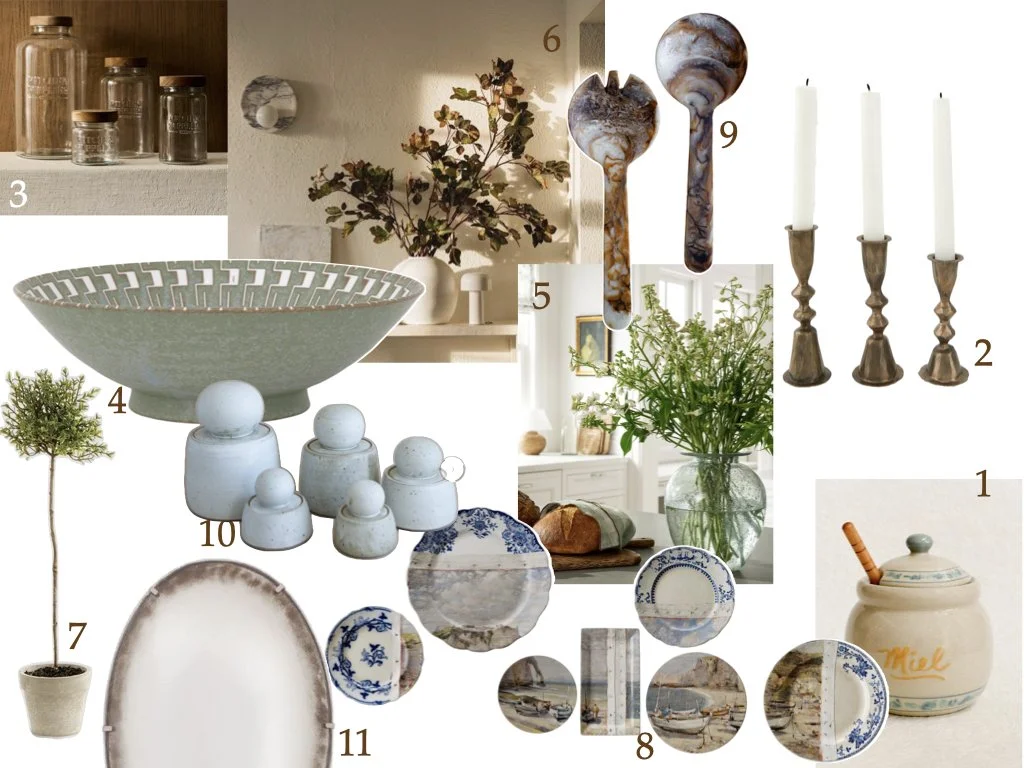 SHOP THIS: 1. Avila ceramic honey jar / Leif. 2. Cecil Taper Holders / Jayson Home. 3. Glass Screw-On Storage Jar / Zara Home. 4. Haruki Bowl / Jayson Home. 5. Gretchen Vase / McGee & Co. 6. Burgundy Green Leaf Branch / Floral. 7. Napa Home & Garden Time Topiary / Floral. 8. The Cliffs of Étretat - Wall Hangings / Wescover. 9. Tortoiseshell Salad Servers / Luxe B Coop. 10. Stash Jars In Alabaster /Coop. 11. Orb Mirror / Alice Lane