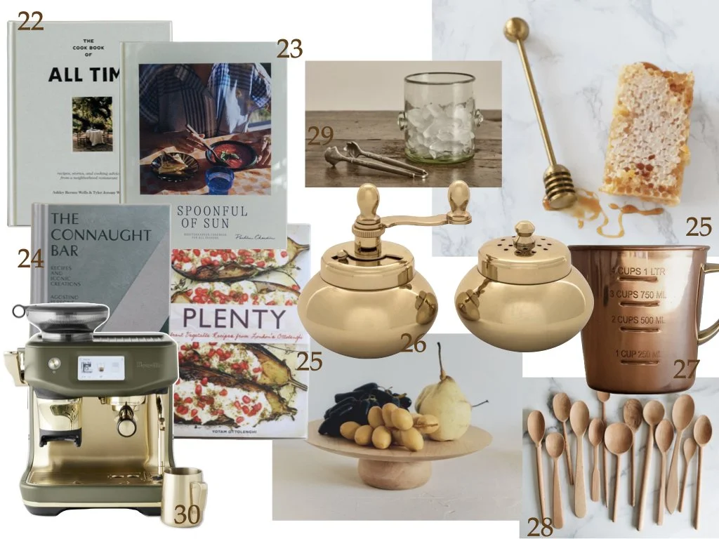 SHOP THIS: 21. All Time Cook Book / Coop. 22. A Spoonful of Sun Mediterranean Cookbook / Coop. 23. The Connaught Bar Cocktail Creations / Coop. 24. Plenty Cookbook / Coop. 25. Brass Honey Dipper / Small Batch. 26. Gold Plated Pepper Mill and Salt Shaker / Artemest 27. Copper Liquid Measuring Cup / Roan Iris. 28. Bakers Dozen Beachwood Spoons / Roan Iris. 29. Mini Ice Bucket / Nickey Kehoe. 30. Breville Barista Touch™ Impress Espresso Machine, Olive Tapenade & Brass / Williams Sonoma.
