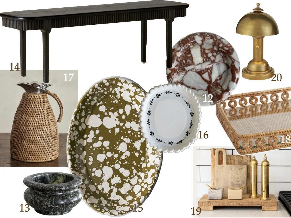 SHOP THIS: 12. Marble Vanity Tray / Amazon. 13. Green Bidasar Stone Bowl / Luxe B Co. 14. Providence 57” Dining Table / CB2. 15. Splatter Enamel Platter / Toast. 16. Hand-painted Posy Tray No. 7/ Roan Iris. 17. Rattan Wrapped Thermos Carafe / Nickey Kehoe. 18. Menton Rectangular Tray / Dear Keaton. 19. Trivet Riser Solid Rustic Wood / Rustike. 20. Thomas O'Brien Totie Task Lamp Visual Comfort / Pergola