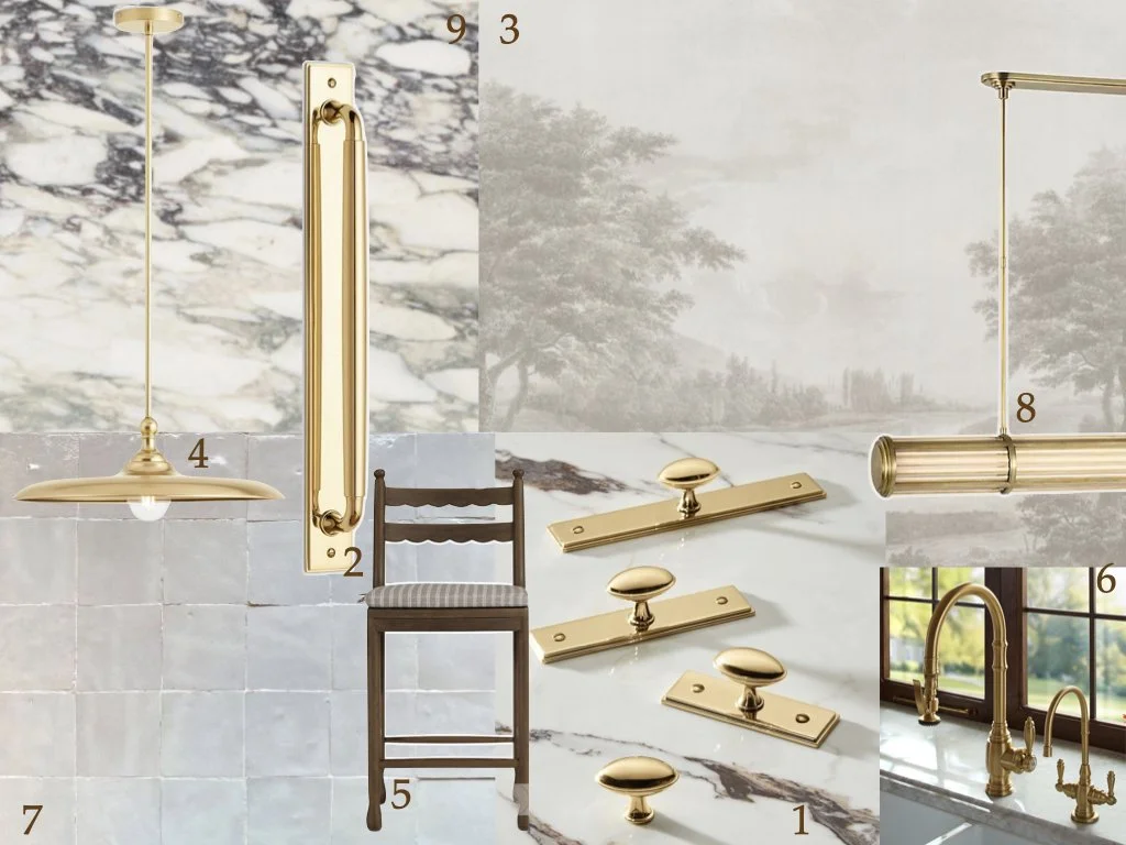 SHOP THIS: 1. Lenonx Cabinet Knob / Rejuvenation. 2. Lennox Appliance Pull / Rejuvenation. 3. Vista Wallpaper 28000 Serene on Cotton / Phillip Jefferies. 4. Theo Pendant / Rejuvenation. 4. Theo Pendant / Rejuvenation. 5. Declan Counter Stool / Lulu and Georgia. 6. Traditional PLP Pulldown Faucet by Waterstone. 7. Zeolite Mosaic Panel 112-D / Cement Tile Shop. 8. Perren Large Linear Chandelier / Ralph Lauren. 9. Calcutta Monet